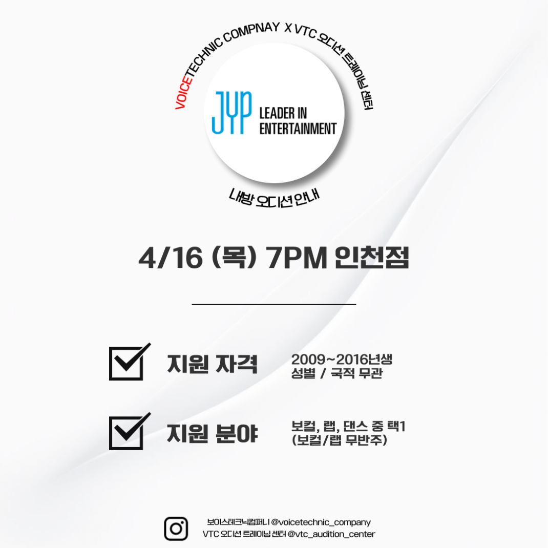 내방 오디션 정보 2026 / 150번째 내방오디션 - JYP엔터테인먼트 작성자관리자 등록일 26-02-13 조회4회 본문 2026 / 150번째 내방오디션 - JYP엔터테인먼트 오디션 합격생 전체 명단 *2025.05.15 2026 / 149번째 내방오디션 - FNC엔터테인먼트 목록